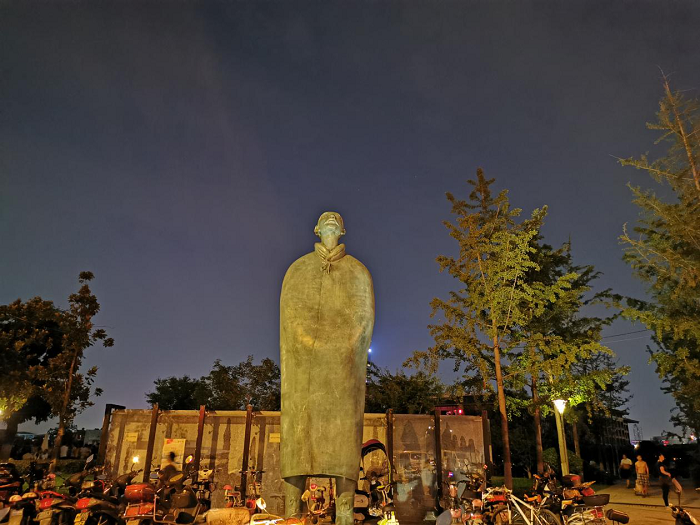 《高山流水》青銅雕塑,參考秦兵馬俑的照明手法,以白色燈光重點照亮雕塑頭部,仿佛在迎著陽光沉思。