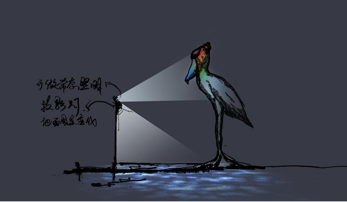 《鯨頭鸛》用水紋燈映亮雕塑周圍環境,以彩色小型投光燈對雕塑局部染色,一副艷麗的鯨頭鸛在河邊休憩的場景便映入眼簾。