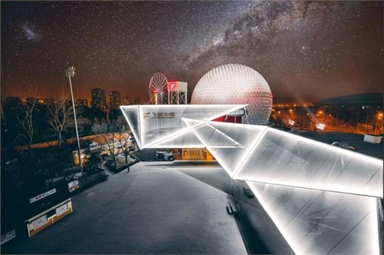 隨著球幕外立面光色切換,“我愛你中國”、“飛覽天下飛越中國”等主題字幕滾動播出。為實現預期的設計效果,信達團隊多次夜間試燈。
