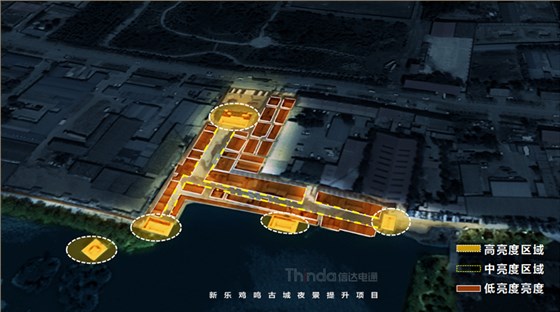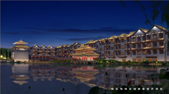 亮化設(shè)計(jì)從宏觀和微觀兩種尺度入手:在宏觀上強(qiáng)調(diào)整體性,建立清晰的夜景結(jié)構(gòu)并區(qū)分主次,體現(xiàn)青磚黛瓦,淡雅風(fēng)華,那種褪盡喧囂之后的寧靜和內(nèi)斂。在微觀上,以人為本實(shí)現(xiàn)照明的舒適性,營造溫馨雅致的光環(huán)境。本案中雞鳴古城亮化設(shè)計(jì)將主入口處城樓及親水樓臺為高亮度區(qū)域,沿街立面烘托商旅氛圍為中亮度,建筑頂部營造靈境、淡雅的光環(huán)境,弱化表現(xiàn)為低亮度區(qū)域。主體光色以暖光呈現(xiàn),靜態(tài)光為主。燈光主要體現(xiàn)其渾厚、大氣的建筑結(jié)構(gòu),打造整體感與形態(tài)美,滿足建筑自身功能和精神需求的同時(shí),突出顯著入口標(biāo)志。以間隔小投光形式呈現(xiàn),突出入口醒目標(biāo)志和節(jié)點(diǎn)設(shè)計(jì)。拒絕大面積重彩潑墨,以投光進(jìn)行小范圍營造,點(diǎn)綴成景,留白處理,避免喧鬧、浮華,營造靜謐、文雅的氛圍。燈光錯(cuò)落有致,層次分明,有熱鬧活力的商旅氛圍,也有溫馨雅致的古典情懷,使人漫步其中,移步異景,感受她的舒適與雅致。