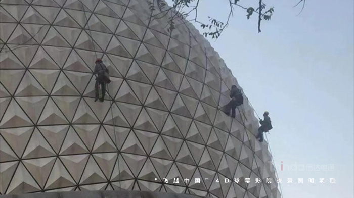隨著球幕外立面光色切換,“我愛你中國”、“飛覽天下飛越中國”等主題字幕滾動播出。為實現(xiàn)預(yù)期的設(shè)計效果,信達(dá)團(tuán)隊多次夜間試燈。