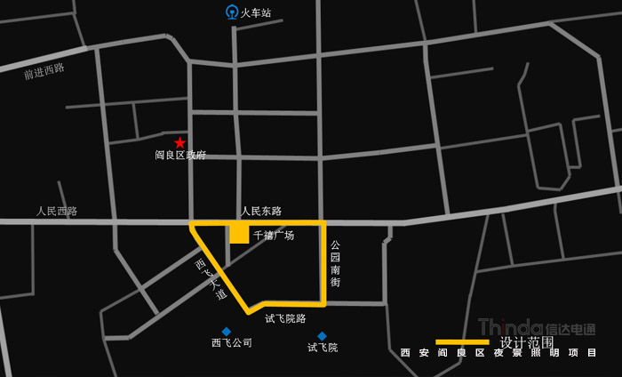 閻良區(qū)位于西安東北部,不但是一座底蘊(yùn)深厚的歷史古城,還是一座資源豐富的航空名城,區(qū)內(nèi)有中航工業(yè)試飛中心、第一飛機(jī)設(shè)計(jì)研究院、西飛公司、中國飛機(jī)強(qiáng)度研究所等大型航空企事業(yè)單位,聚集了1/3以上的航空資源。閻良已成為中國唯一、亞洲最大的六位一體的航空工業(yè)基地,被譽(yù)為“中國航空城”。本案亮化設(shè)計(jì)范圍為閻良區(qū)人民東路、西飛大道、試飛院路、公園南街等四條道路兩側(cè)的30余棟建筑及廣場、景觀帶。