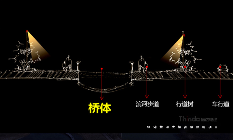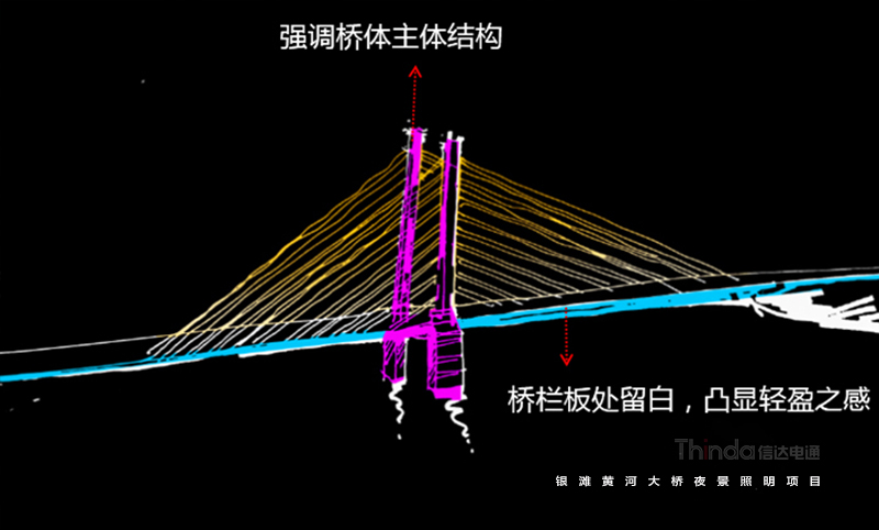銀灘黃河大橋夜景亮化設(shè)計(jì)中我們以功能性、裝飾性照明為主,同時(shí)也避免高亮度、多光色對(duì)行車造成安全隱患。