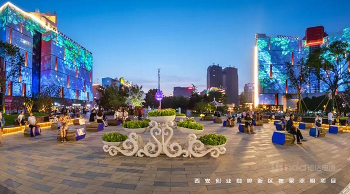 信達電通在2017年完成了眾多大型城市亮化項目,其中濃墨重彩的一筆當屬西安創業咖啡街區的亮化。