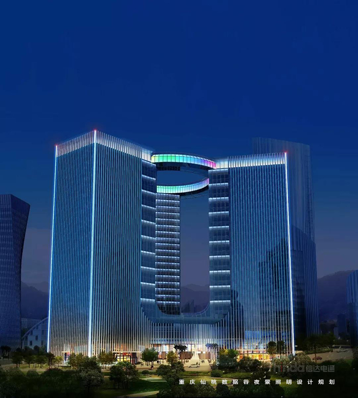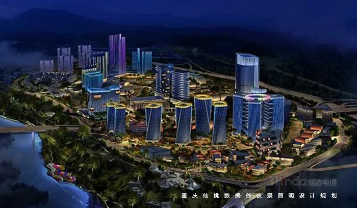 信達電通以梳理景觀層次,打造宜觀、宜居的夜環境;綜合國家照明標準與仙桃國際數據谷自身特性,合理規劃功能照明;在防控光污染、照明控制技術、照明手法三個層面體現“仙桃國際數據谷”,打造智慧城市、低碳交通、健康宜居環境、科技智慧支撐平臺;營造優美的重慶夜景觀城市地標為照明目標。